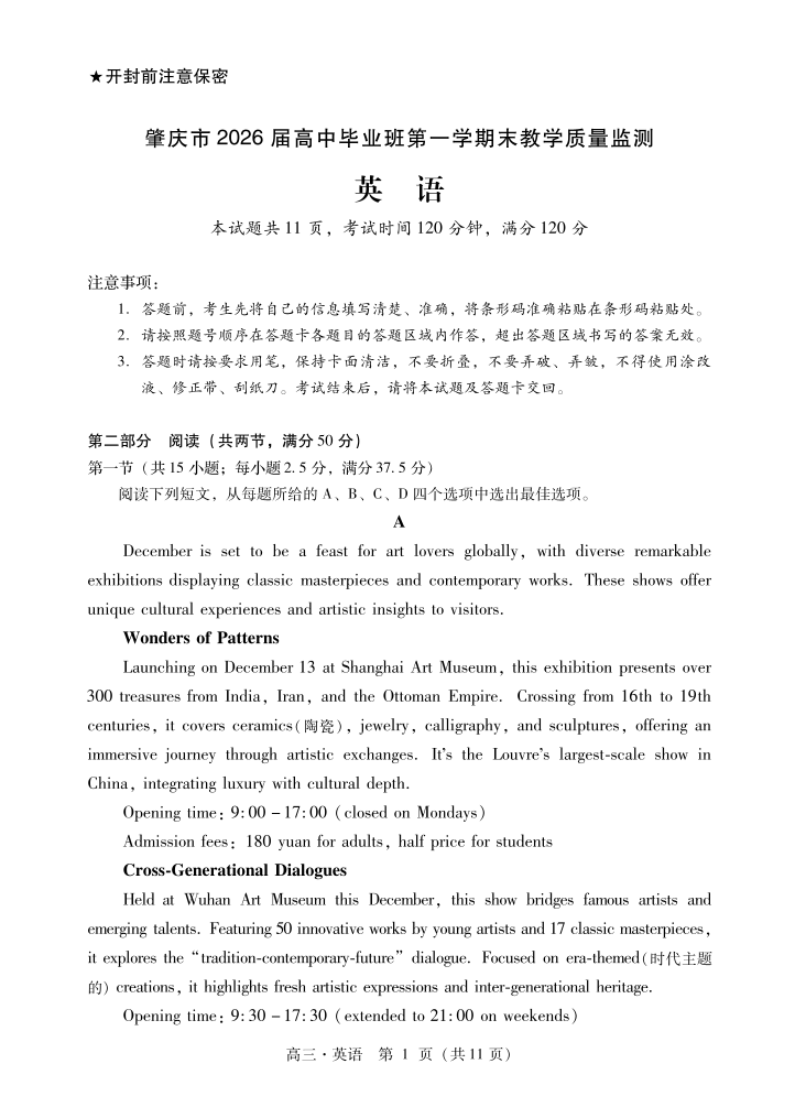 高三英语--广东省肇庆市2026届高中毕业班高三年级第一学期末教学质量监测(肇庆二模)