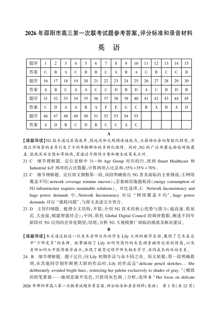高三英语答案--湖南省邵阳市2026届高三第一次联考(邵阳一模)