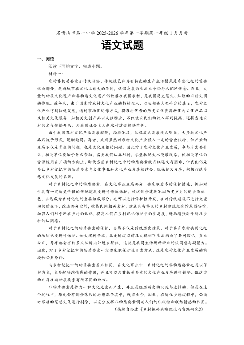 高一语文--宁夏回族自治区石嘴山市第一中学2025-2026学年高一上学期1月月考