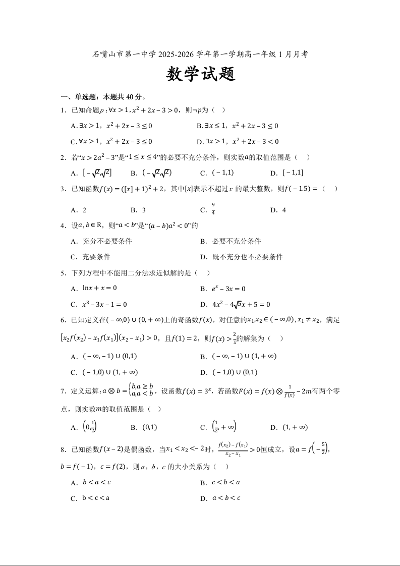 高一数学--宁夏回族自治区石嘴山市第一中学2025-2026学年高一上学期1月月考