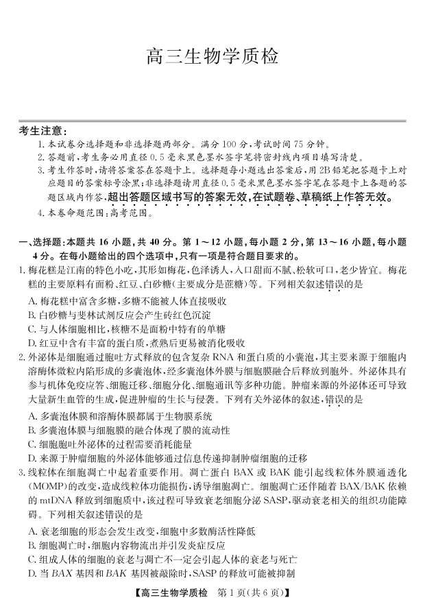 高三生物--广东省梅州市2026届高三上学期1月期末考试