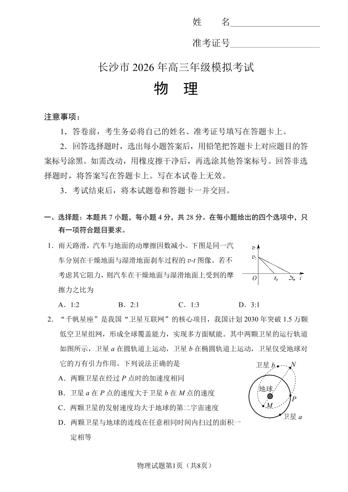 高三物理--湖南省长沙市2026届高三年级模拟考试(长沙一模)