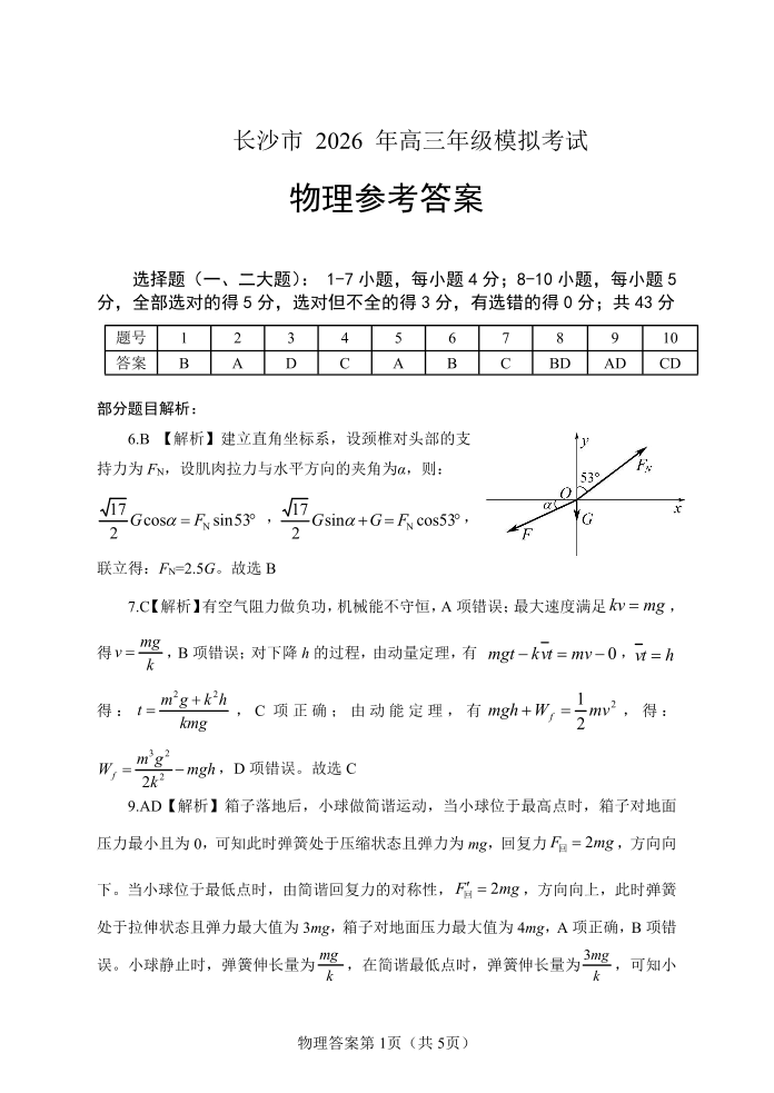 高三物理答案--湖南省长沙市2026届高三年级模拟考试(长沙一模)