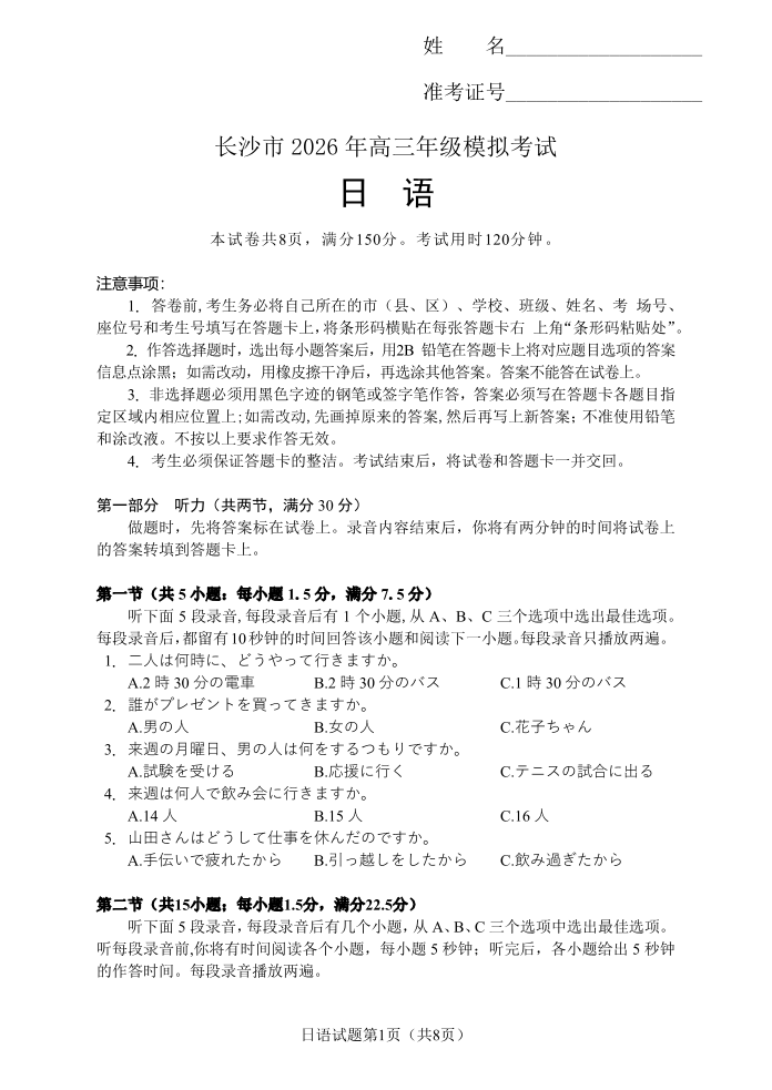 高三日语--湖南省长沙市2026届高三年级模拟考试(长沙一模)