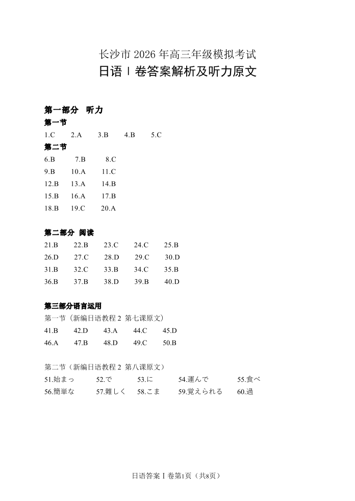 高三日语答案--湖南省长沙市2026届高三年级模拟考试(长沙一模)