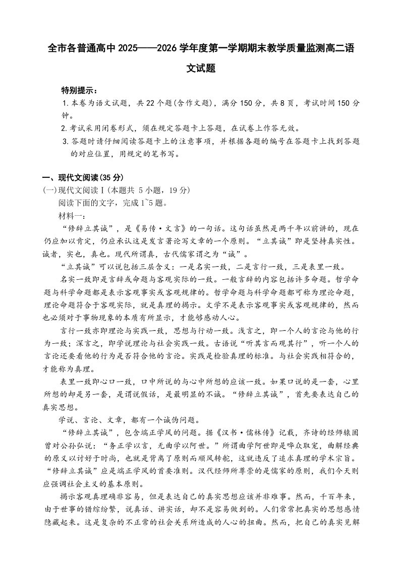 高二语文+答案--贵州省安顺市2025-2026年高二上学期1月期末考试