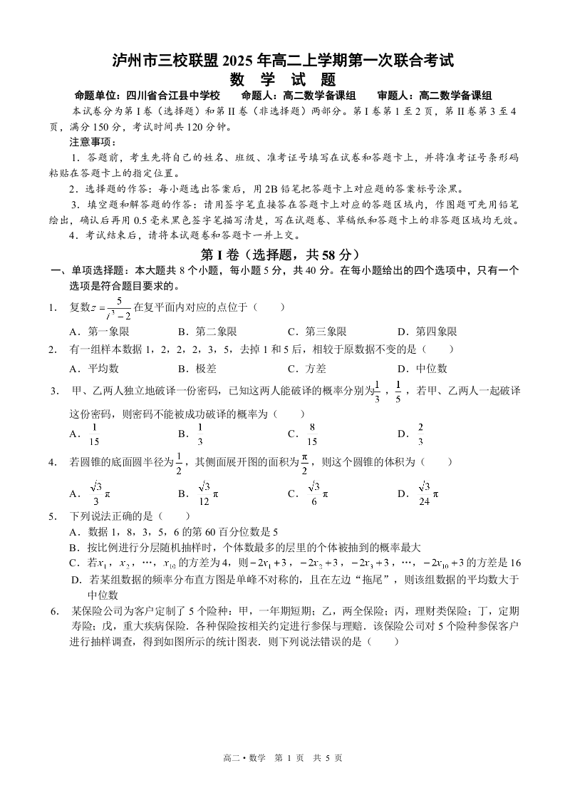 高二数学--四川省泸州市三校联盟2025-2026学年高二上学期第一次联合考试