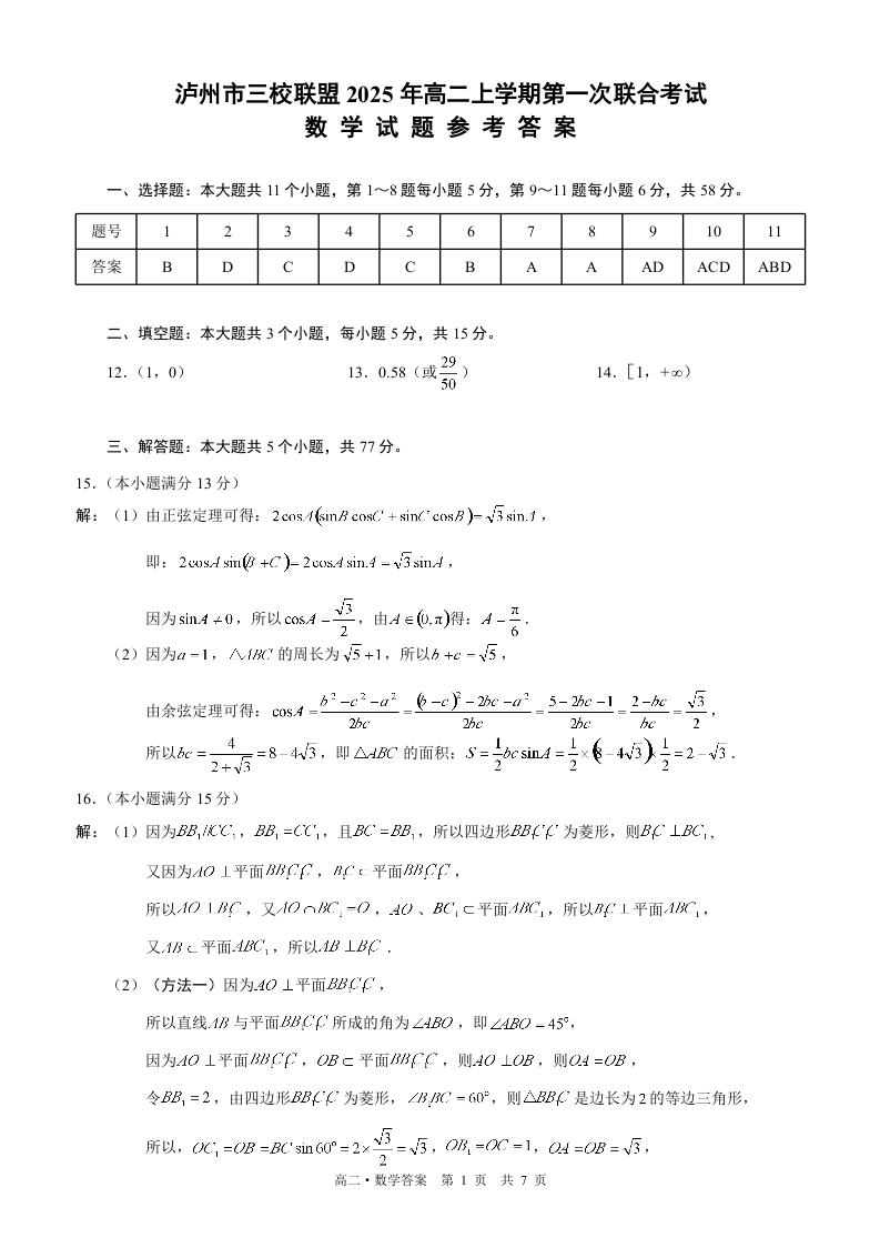 高二数学答案--四川省泸州市三校联盟2025-2026学年高二上学期第一次联合考试