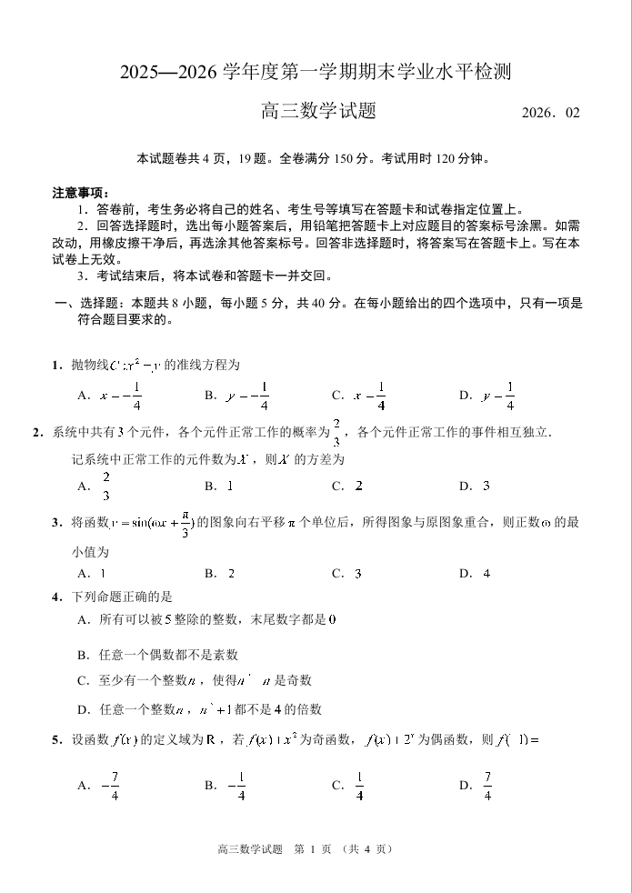 高三数学--山东省青岛区域2026.2高三期末检测