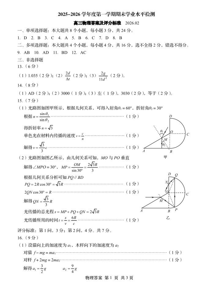 高三物理答案--山东省青岛区域2026.2高三期末检测