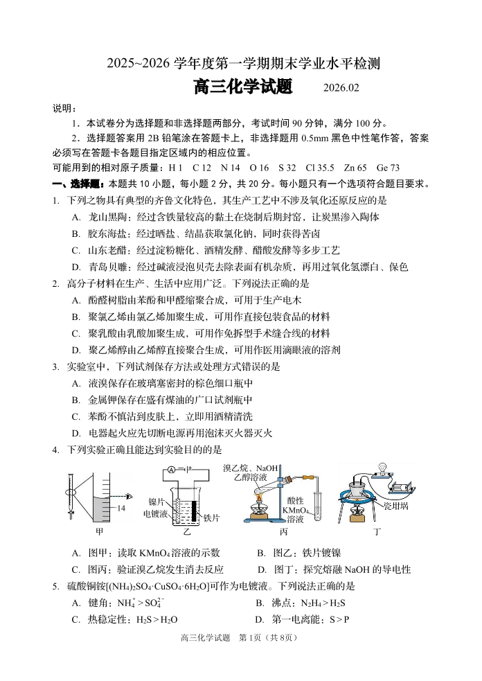 高三化学--山东省青岛区域2026.2高三期末检测