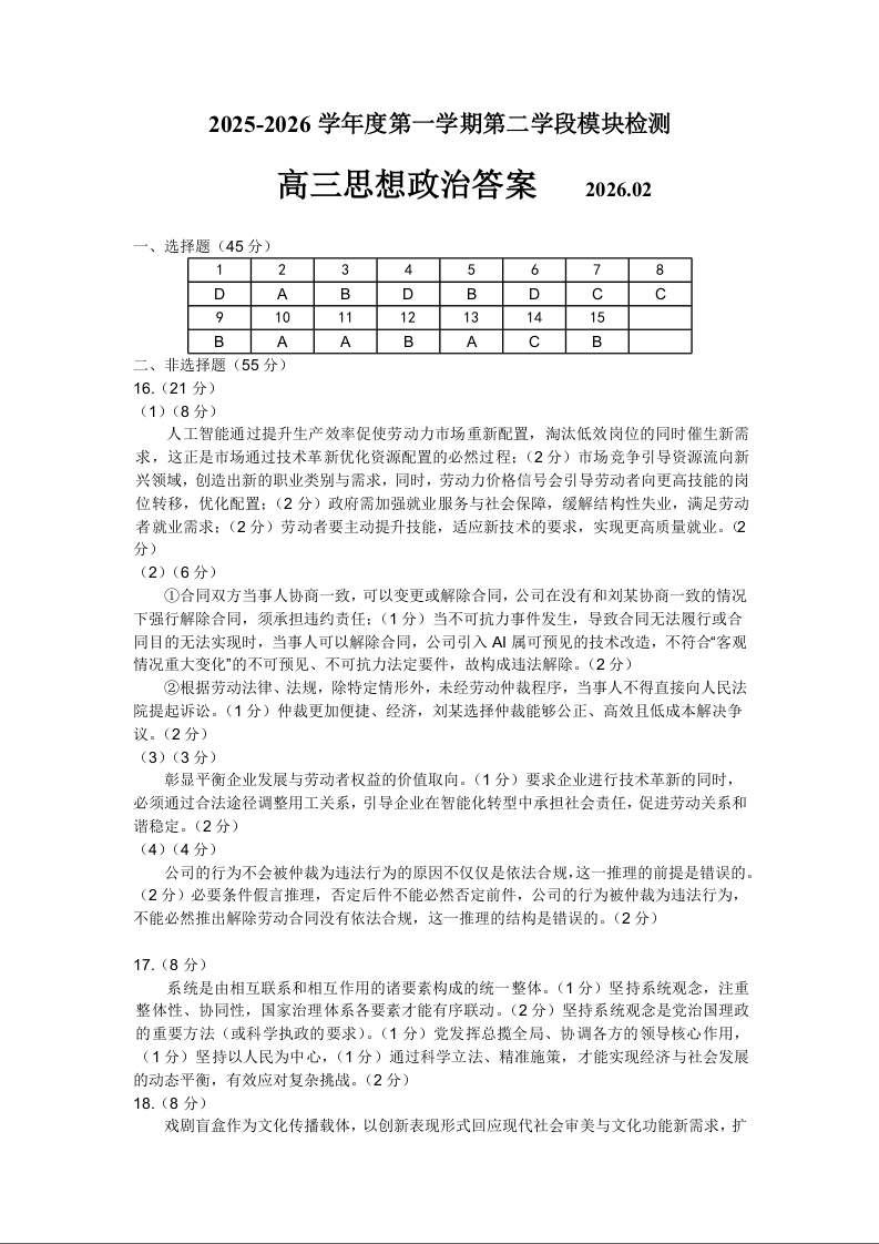 高三政治答案--山东省青岛区域2026.2高三期末检测