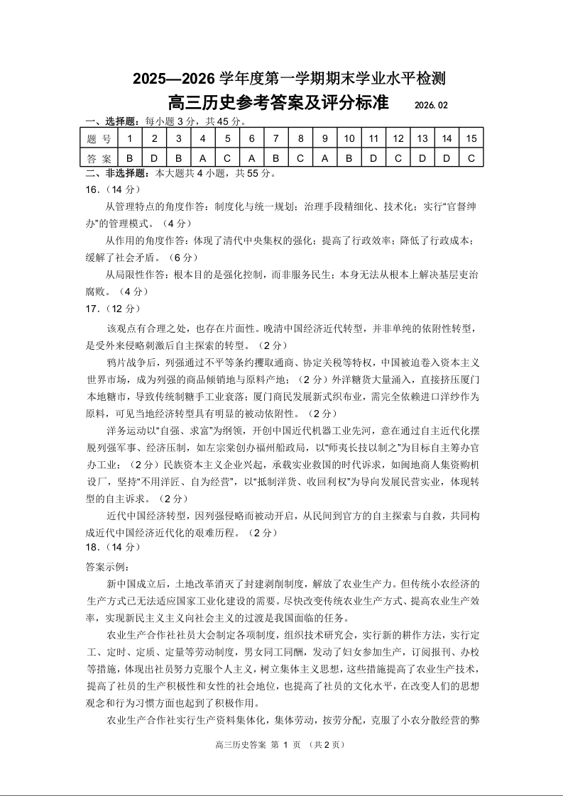 高三历史答案--山东省青岛区域2026.2高三期末检测