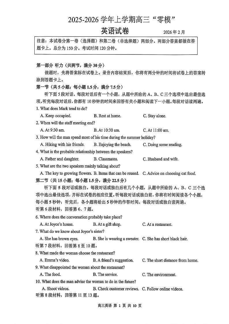 高三英语--江苏省镇江市2026届高三上学期零模