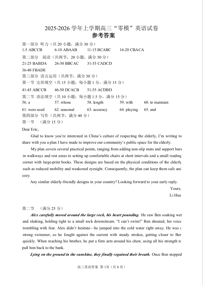 高三英语答案--江苏省镇江市2026届高三上学期零模