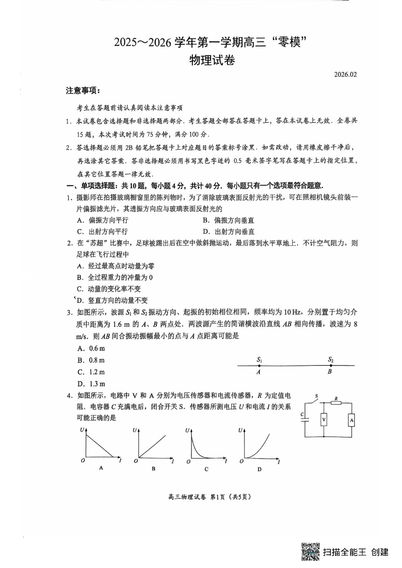 高三物理+答案--江苏省镇江市2026届高三上学期零模