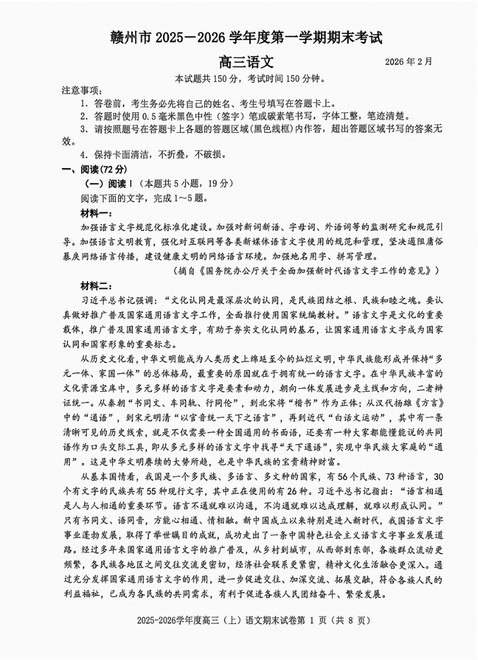 高三语文--江西省赣州市2026届第一学期高三上学期期末考试