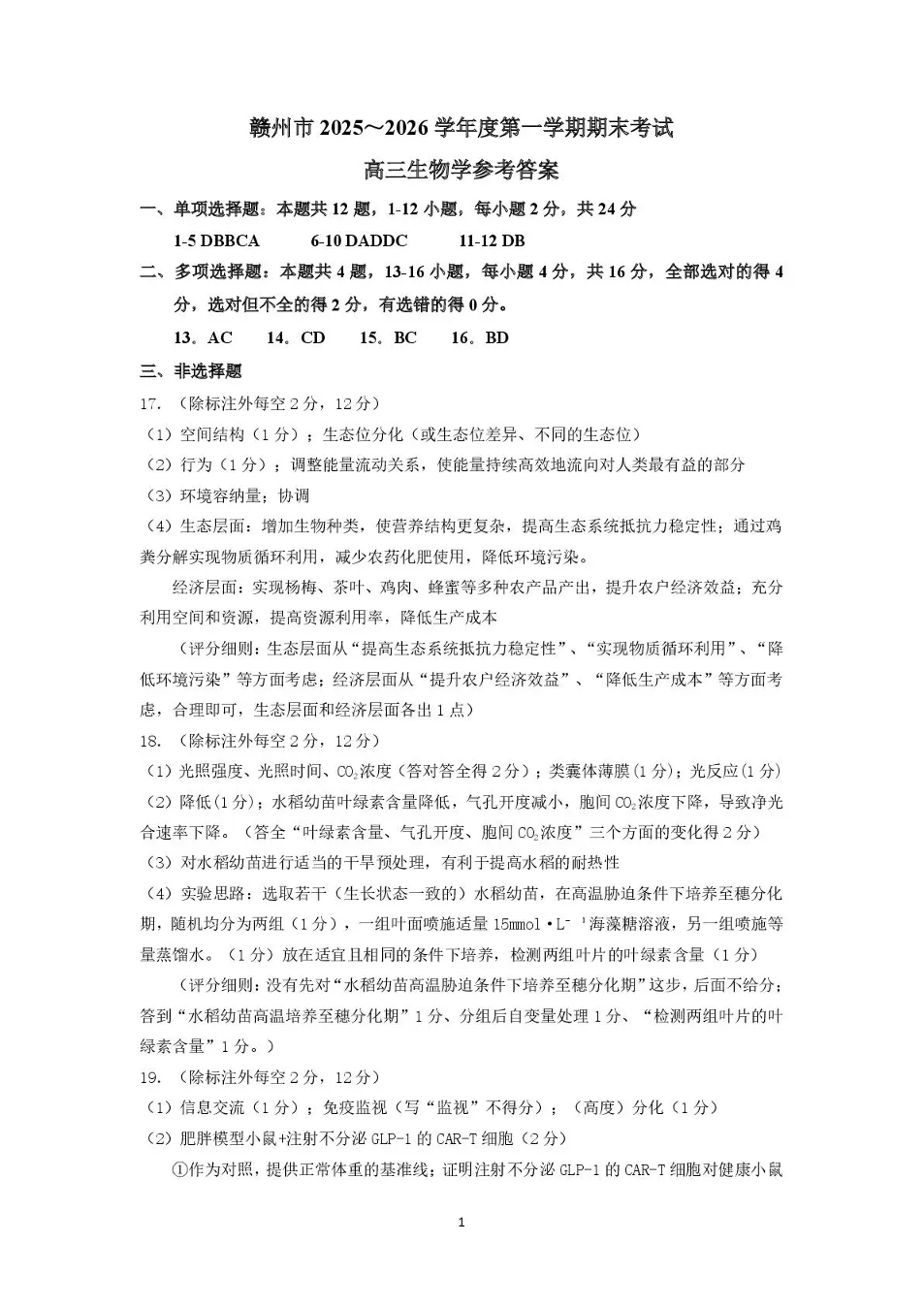 高三生物答案--江西省赣州市2026届第一学期高三上学期期末考试