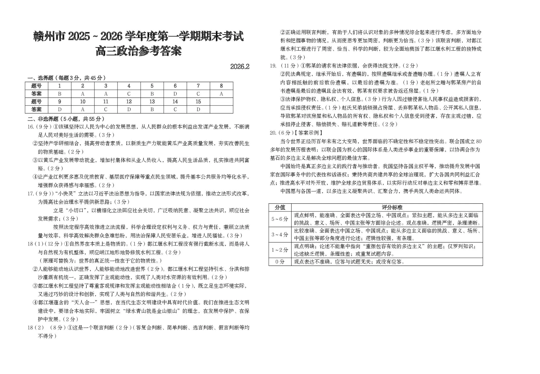高三政治答案--江西省赣州市2026届第一学期高三上学期期末考试