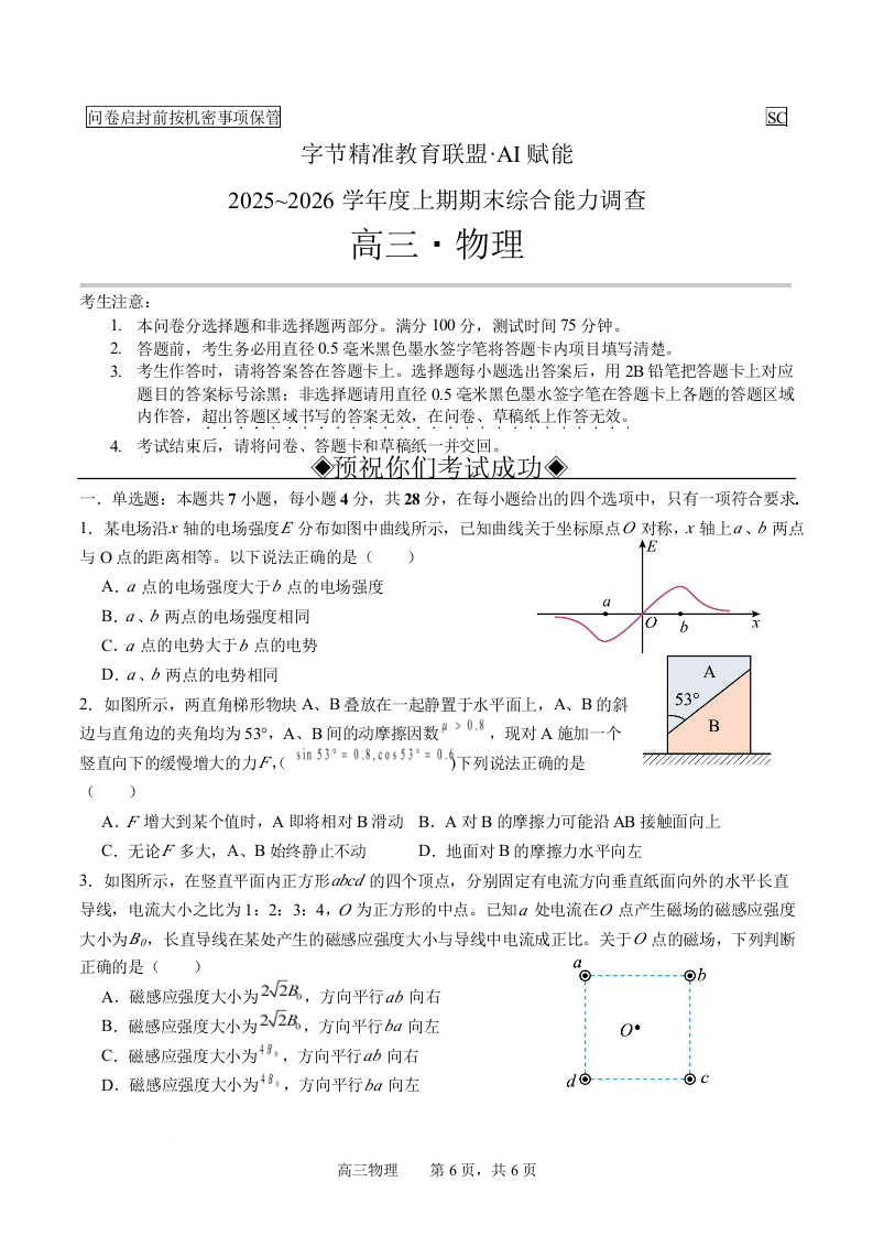 高三物理+答案--四川省字节精准教育联盟2026届高三上学期期末综合能力调查