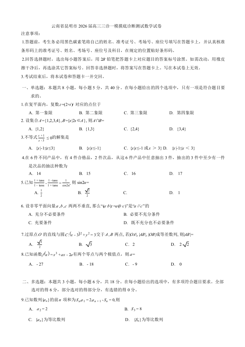 高三数学+答案--云南省昆明市2026届高三上学期1月期末摸底诊断测试