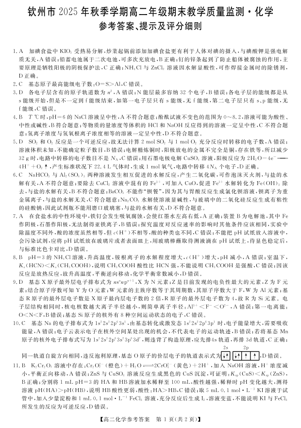 高二化学答案--广西钦州市2025-2026高二上学期期末教学质量检测