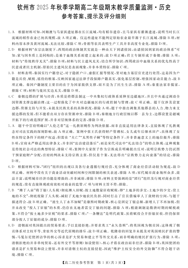 高二历史答案--广西钦州市2025-2026高二上学期期末教学质量检测