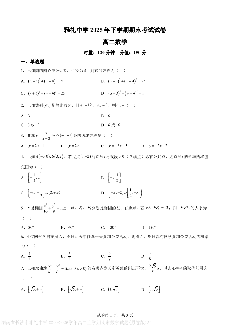 高二数学(原卷版)--湖南省长沙市雅礼中学2025-2026学年高二上学期期末考试