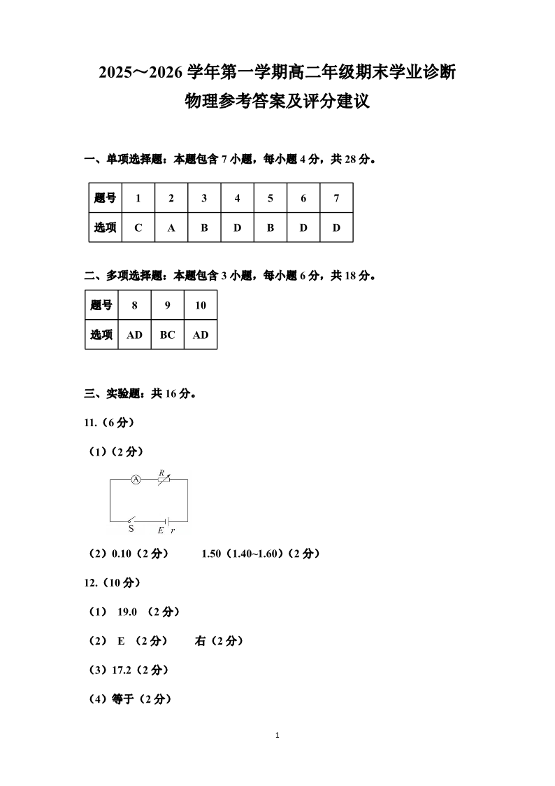 高二物理答案--山西省太原市2025-2026学年高二上学期期末学业诊断