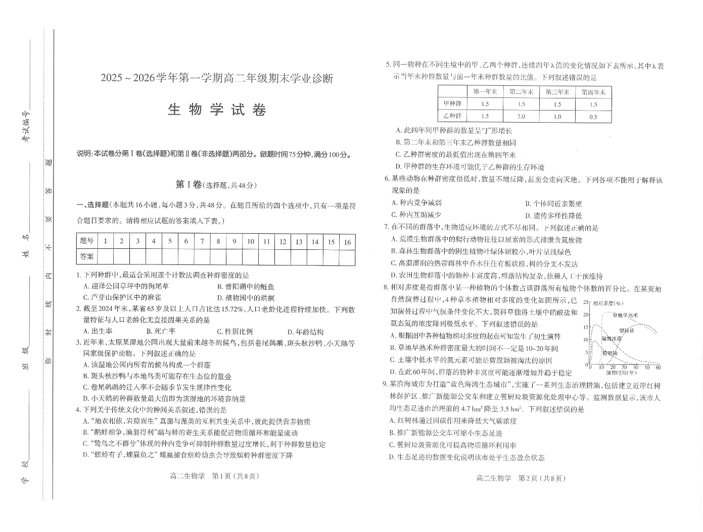 高二生物--山西省太原市2025-2026学年高二上学期期末学业诊断