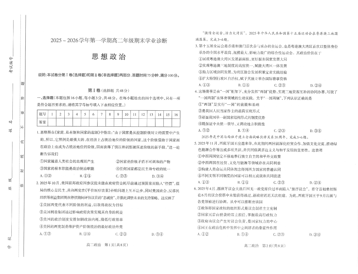 高二政治--山西省太原市2025-2026学年高二上学期期末学业诊断