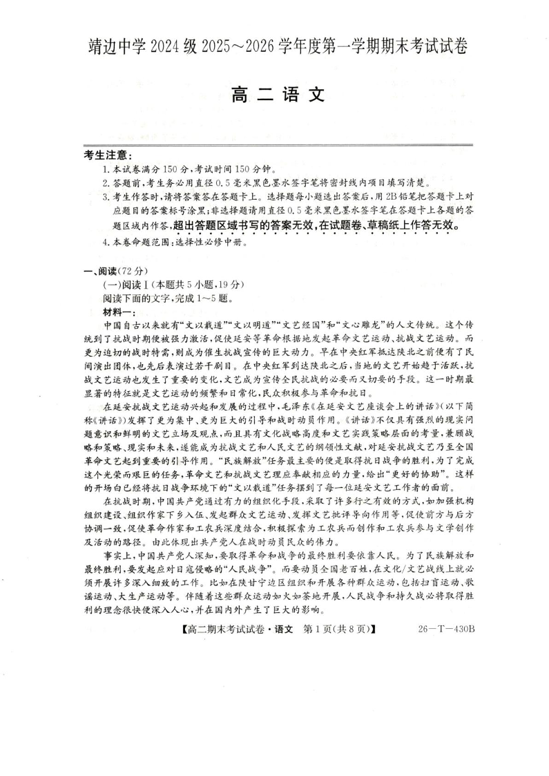 高二语文+答案--陕西省榆林市靖边县靖边中学2025-2026学年高二上学期期末考试