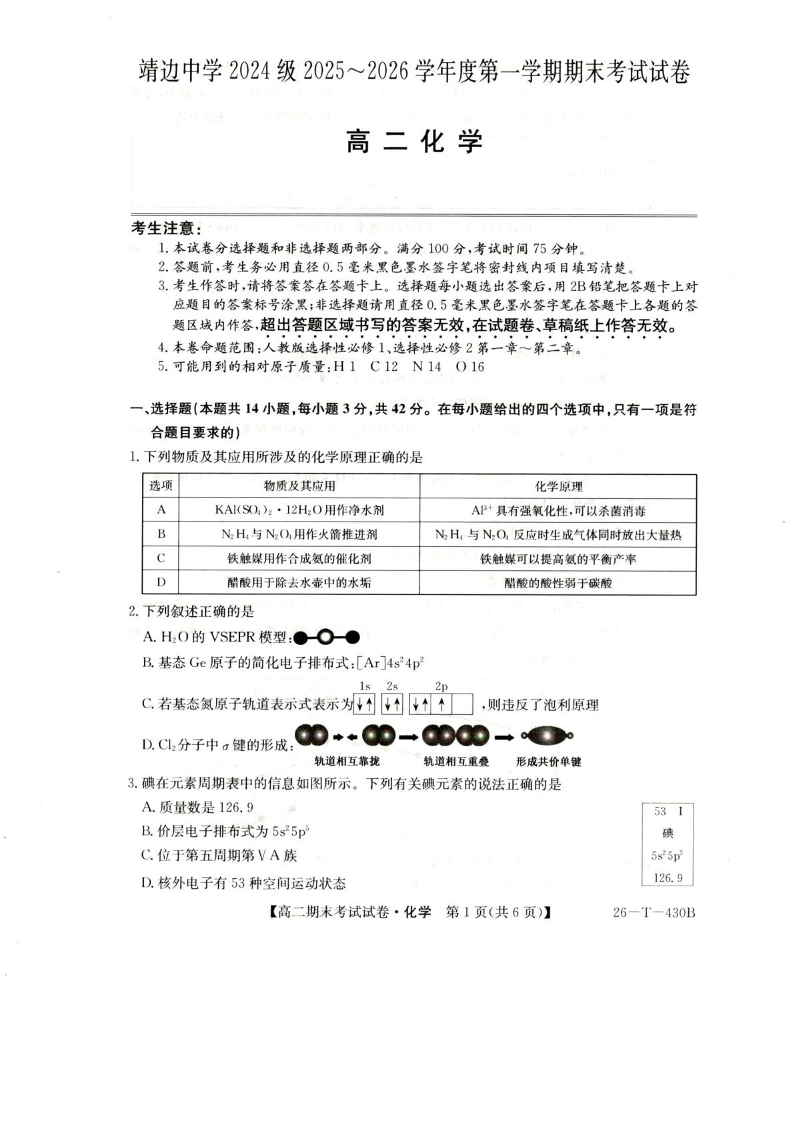 高二化学+答案--陕西省榆林市靖边县靖边中学2025-2026学年高二上学期期末考试