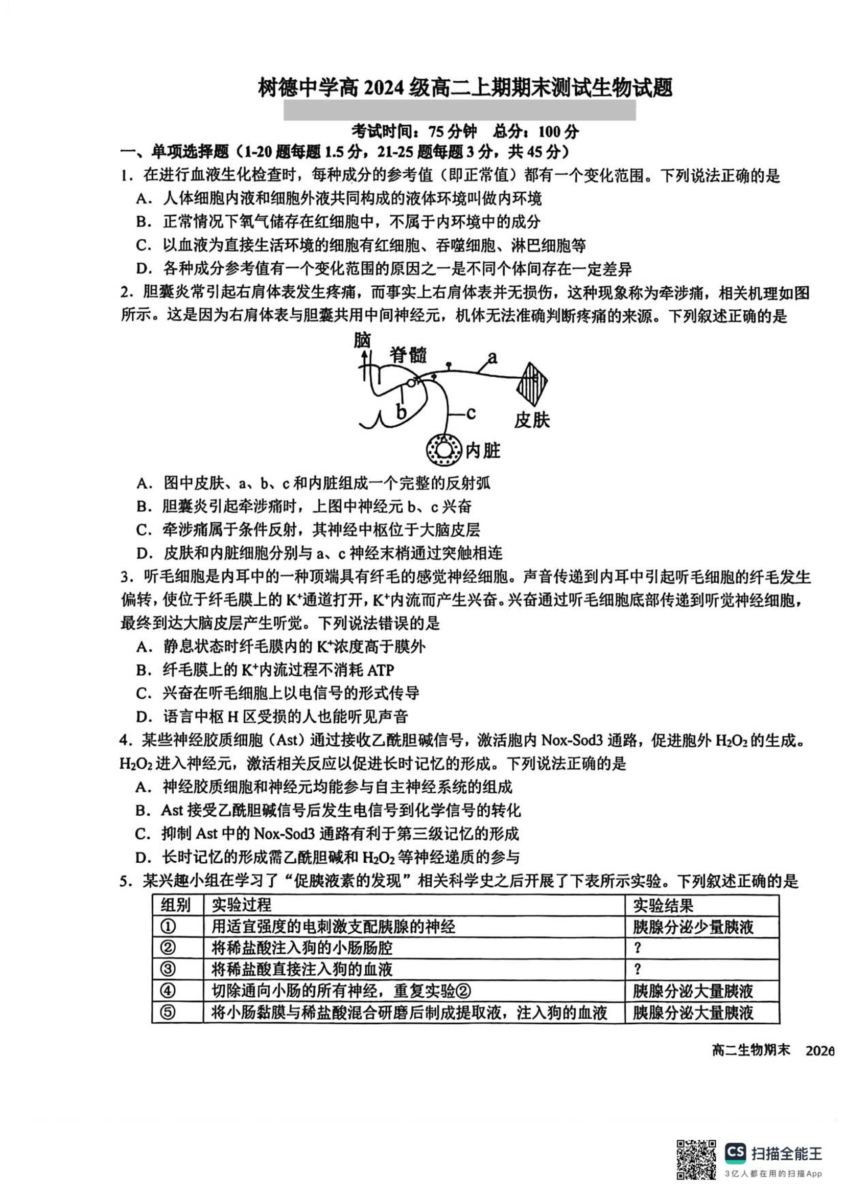 高二生物+答案--四川省成都市树德中学2025-2026学年高二上学期期末