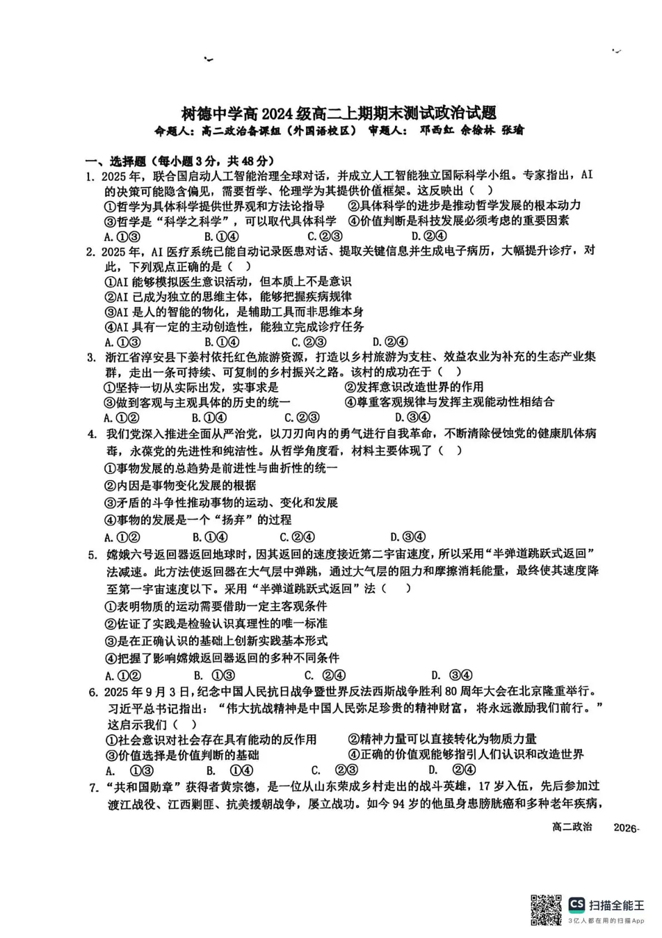 高二政治--四川省成都市树德中学2025-2026学年高二上学期期末