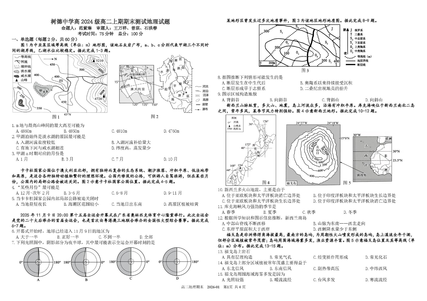 高二地理+答案--四川省成都市树德中学2025-2026学年高二上学期期末