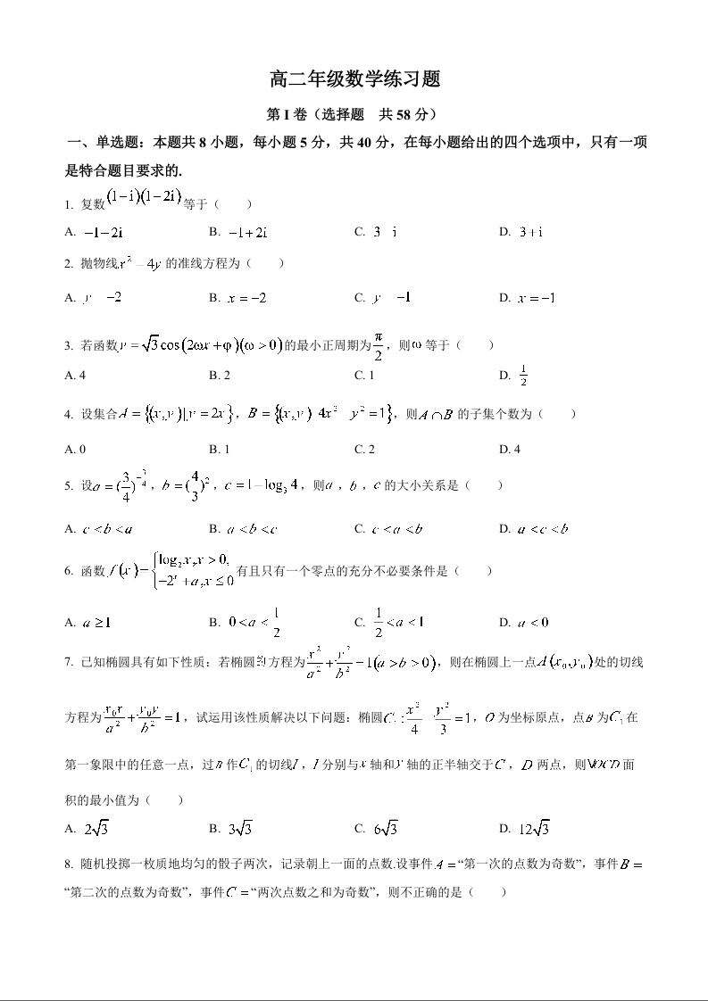 高二数学--四川省德阳市2025-2026学年高二上学期期末考试