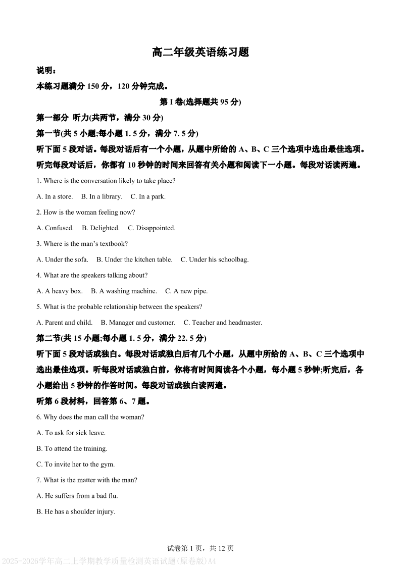 高二英语(原卷版)--四川省德阳市2025-2026学年高二上学期期末考试