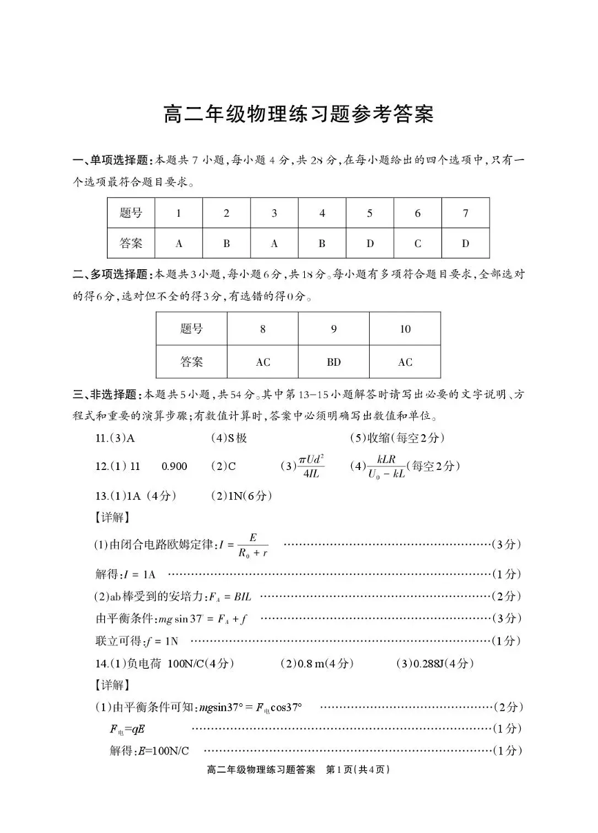 高二物理答案--四川省德阳市2025-2026学年高二上学期期末考试
