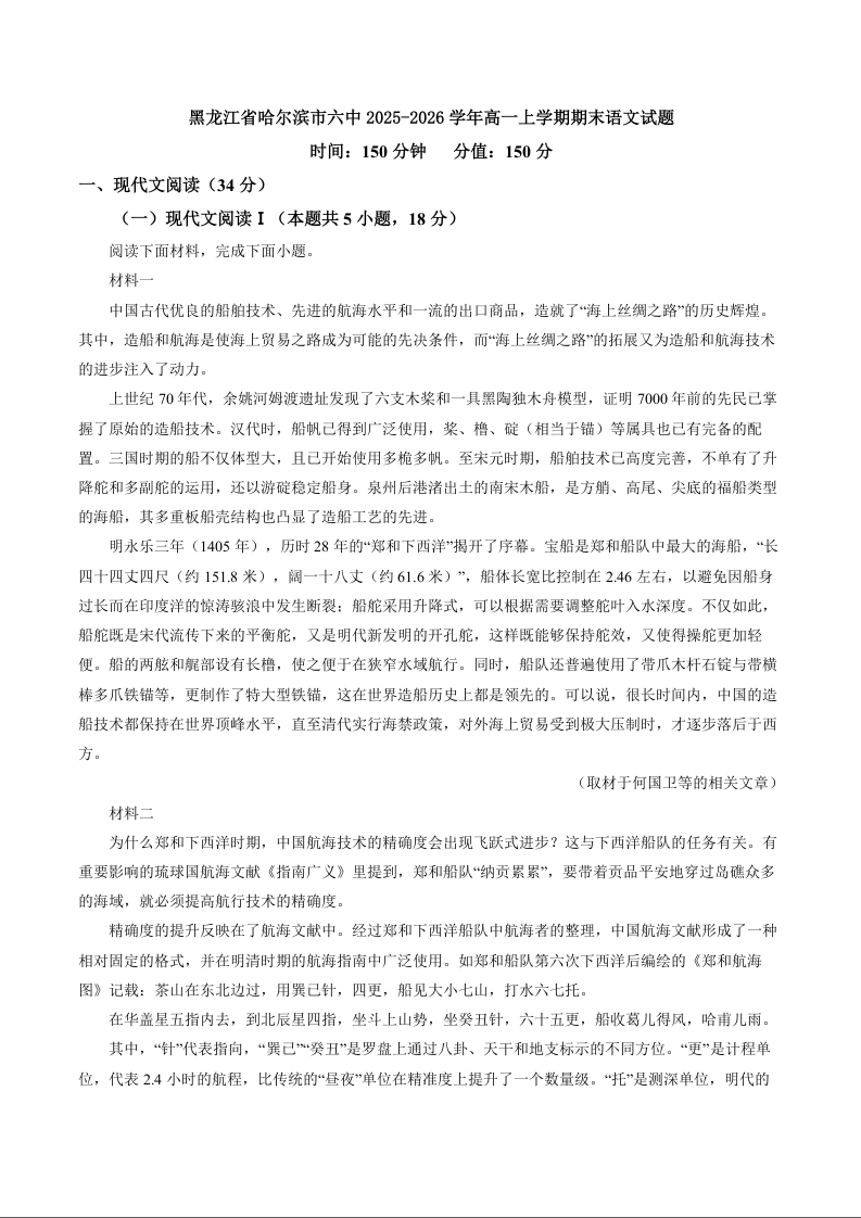 高一语文+答案--黑龙江省哈尔滨市第六中学2025-2026学年高一上学期期末