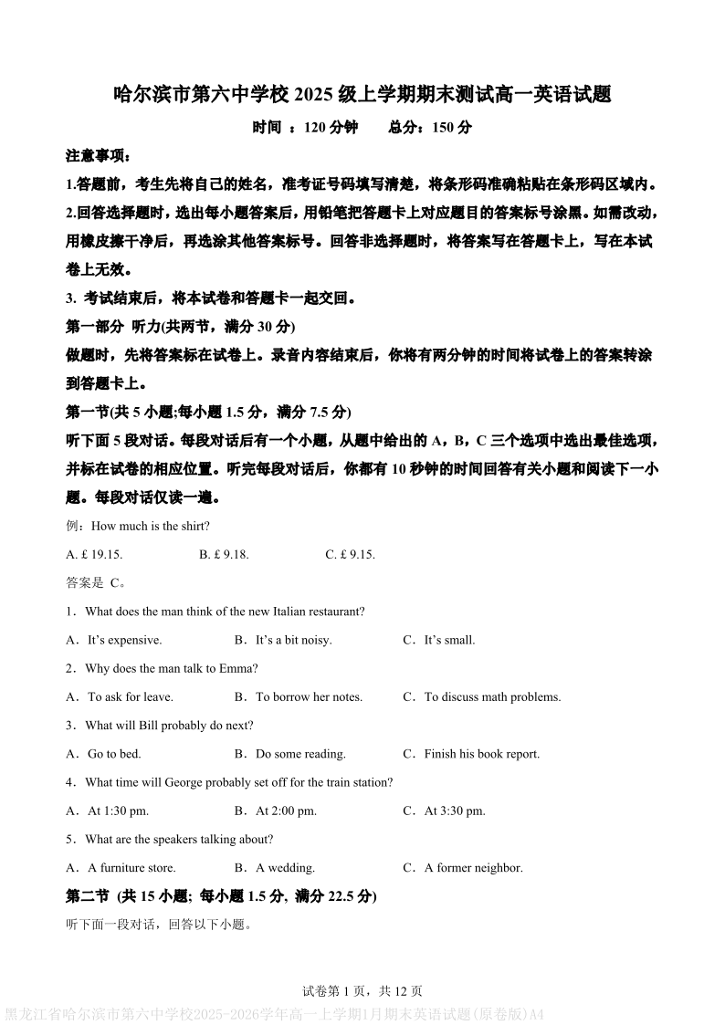 高一英语--黑龙江省哈尔滨市第六中学2025-2026学年高一上学期期末