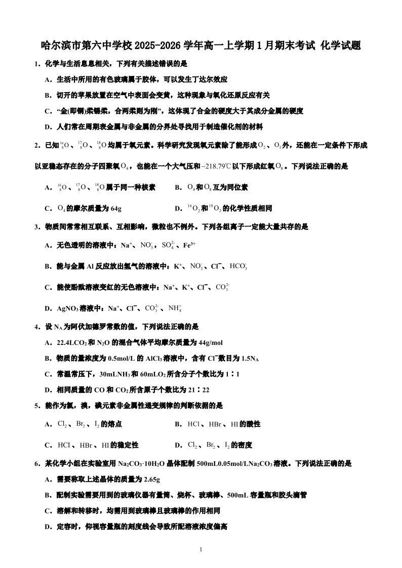 高一化学+答案--黑龙江省哈尔滨市第六中学2025-2026学年高一上学期期末