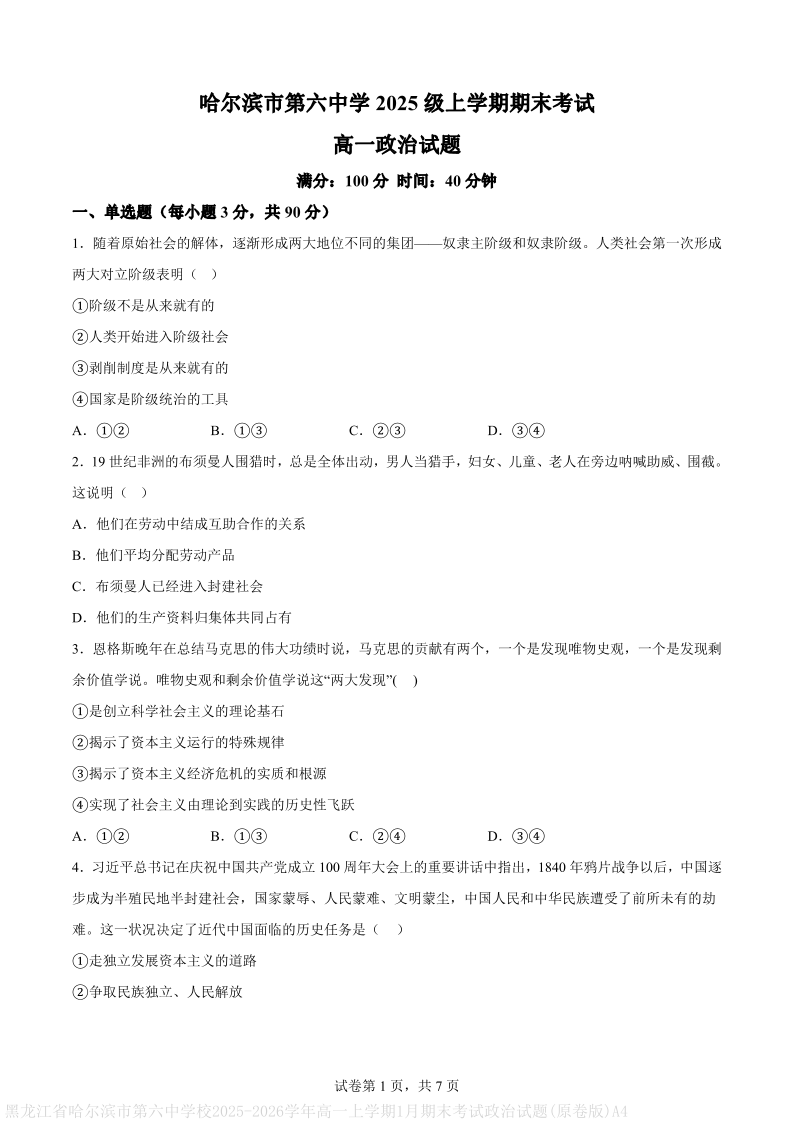 高一政治--黑龙江省哈尔滨市第六中学2025-2026学年高一上学期期末