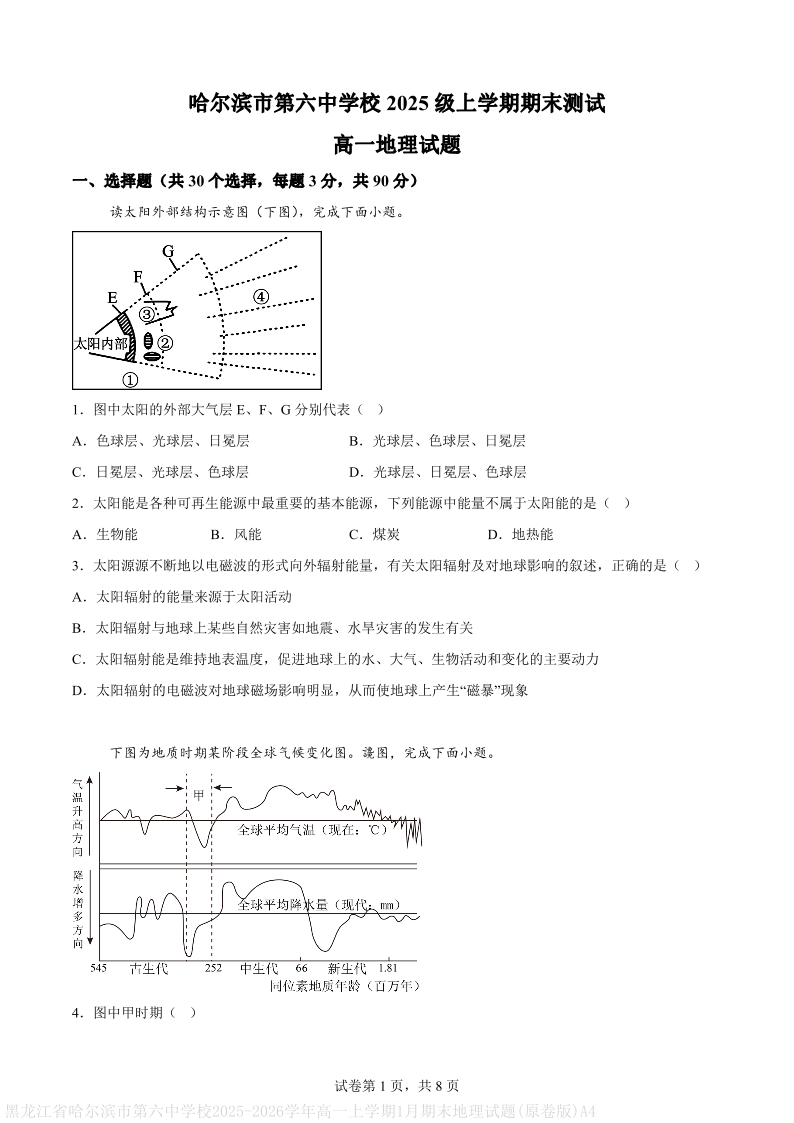 高一地理(原卷版)--黑龙江省哈尔滨市第六中学2025-2026学年高一上学期期末