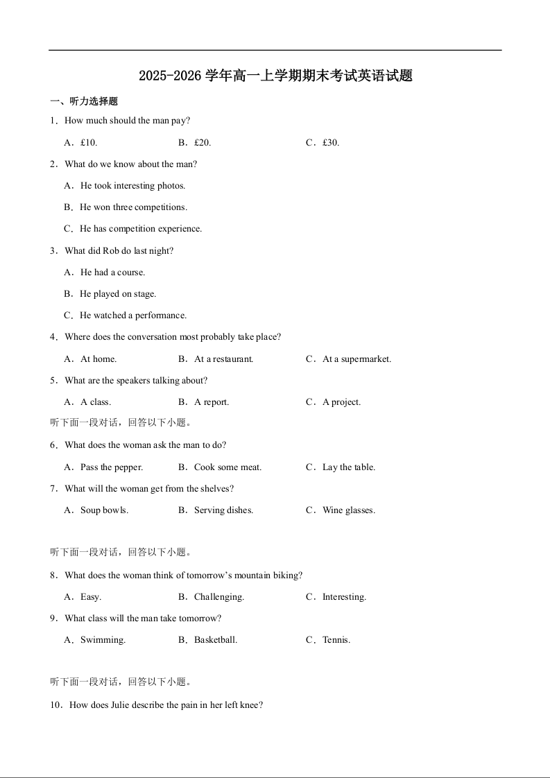 高一英语+答案--湖南省长沙市雅礼中学2025-2026学年高一上学期期末考试