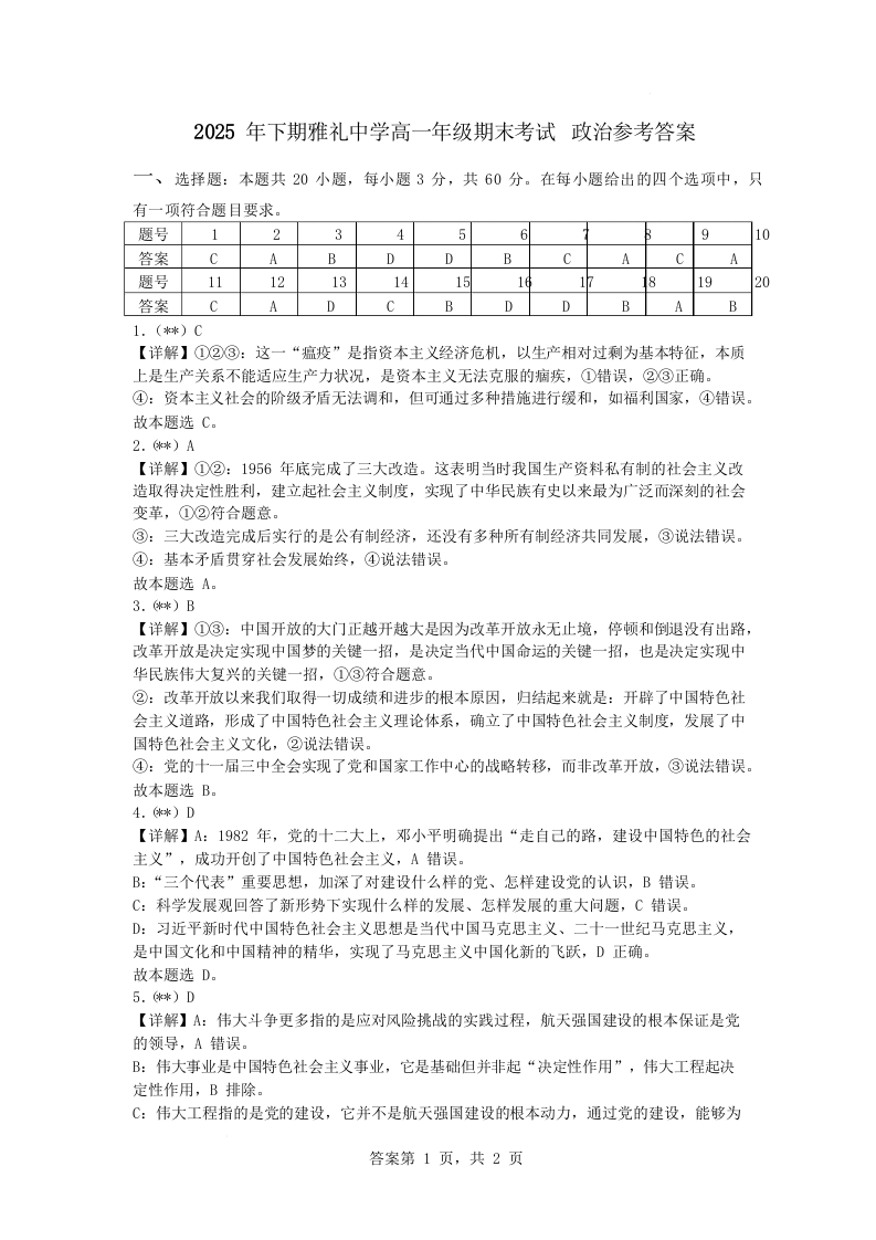 高一政治答案--湖南省长沙市雅礼中学2025-2026学年高一上学期期末考试