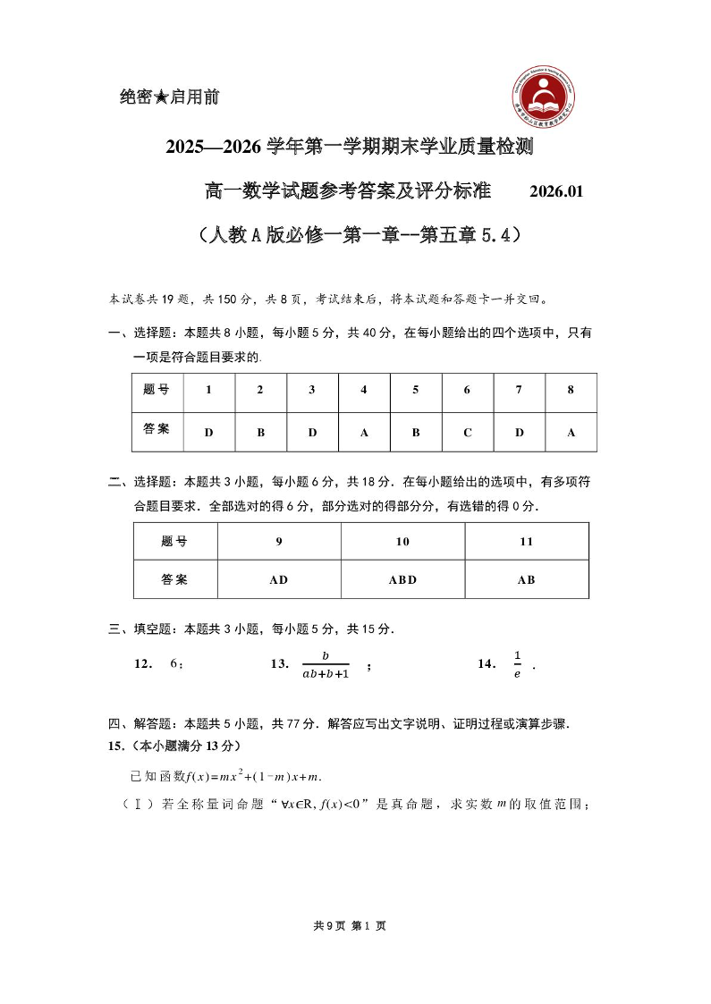 高一数学答案--内蒙古赤峰市松山区2025-2026学年高一上学期期末学业质量检测
