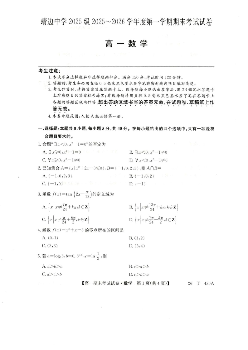 高一数学+答案--陕西省榆林市靖边县靖边中学2025-2026学年高一上学期期末考试