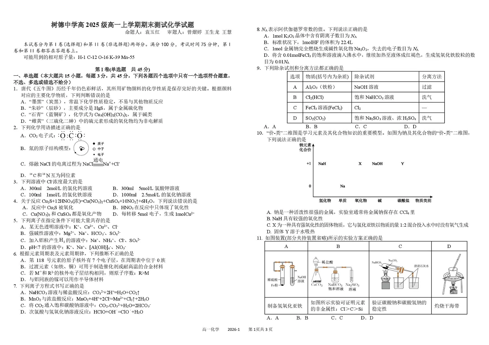高一化学+答案--四川省成都市树德中学2025-2026学年高一上学期期末