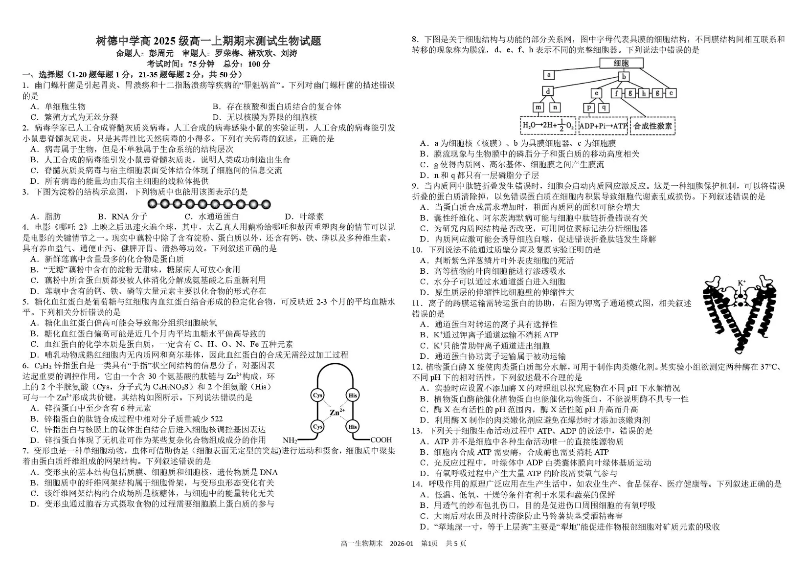 高一生物+答案--四川省成都市树德中学2025-2026学年高一上学期期末